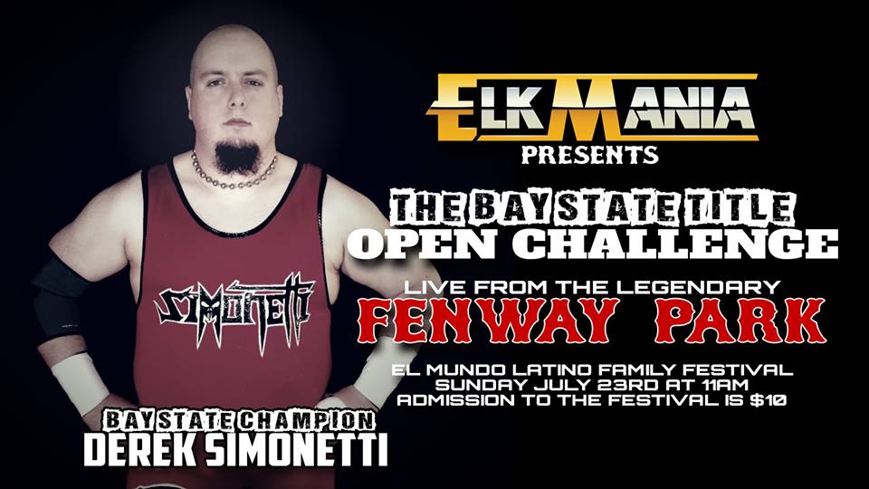legendary names such as George “The Animal” Steele, Captain Lou Albano and The Sheik have also wrestled on this stage. On Sunday, ElkMania Promotions’ Bay State Champion, Derek Simonetti, will add his name to that list. He’s issued an open challenge to defend the title against any and all challengers.