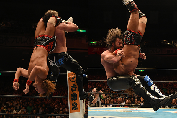 Omega vs. Naito in the G-1 Finals was just…Phenomenal in every sense of the word. Each wrestler delivered big move after big move. Naito hit several reverse hurricanranas and Omega replied with many, many V-Trigger knees. Omega also delivered a piledriver on to a table, which looked botched because Naito’s head missed the table. It actually did more damage by hitting the bottom rung of the ringside guardrail.