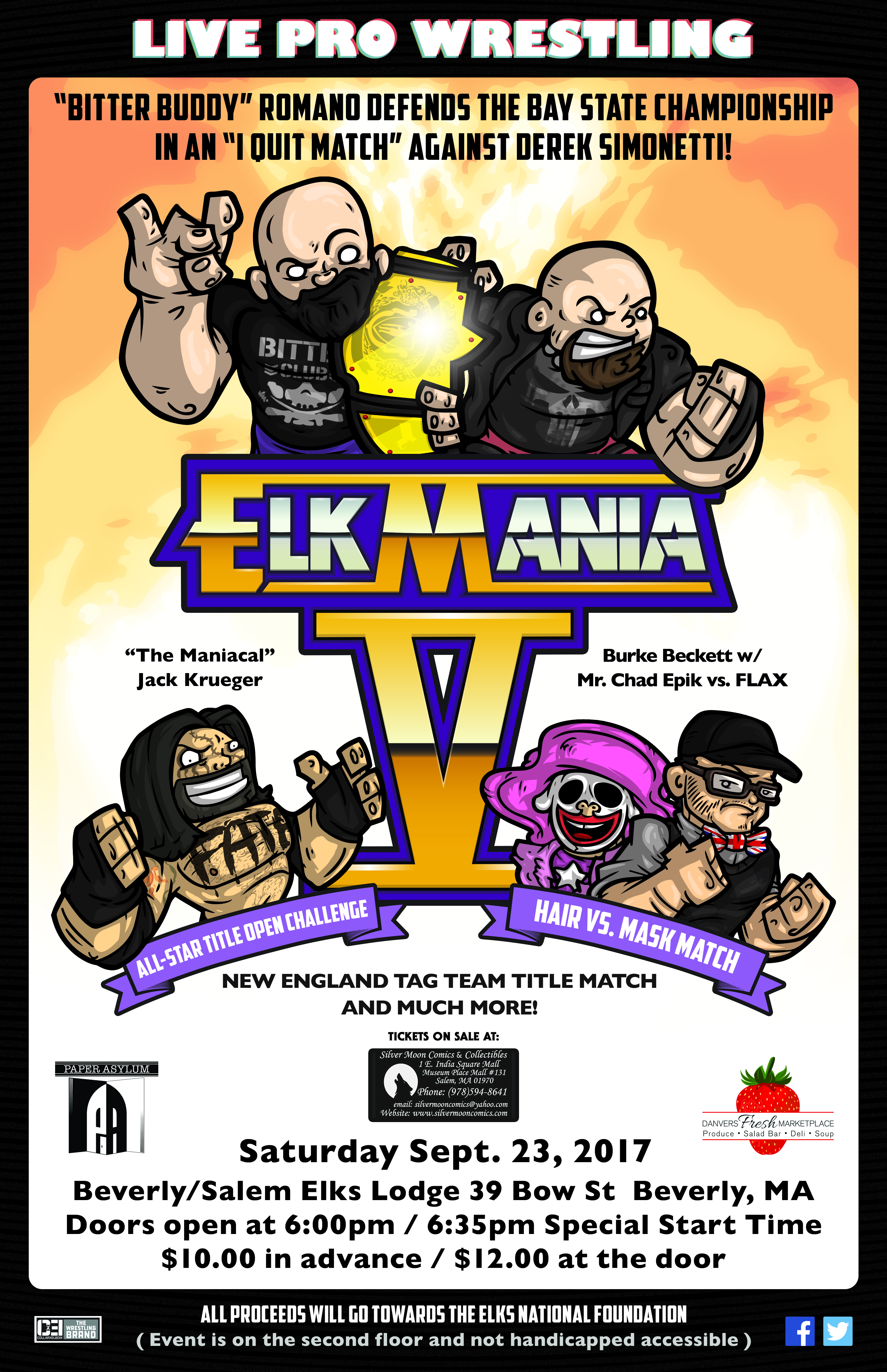 BEVERLY, MA, September 23, 2017 – Professional wrestling returns to the Beverly/Salem Elks Lodge on tomorrow night on Saturday, September 23 for the fifth installment of our preeminent event, ELKMANIA 5. Doors open at 6:00 PM. Special bell time is at 6:35 PM.