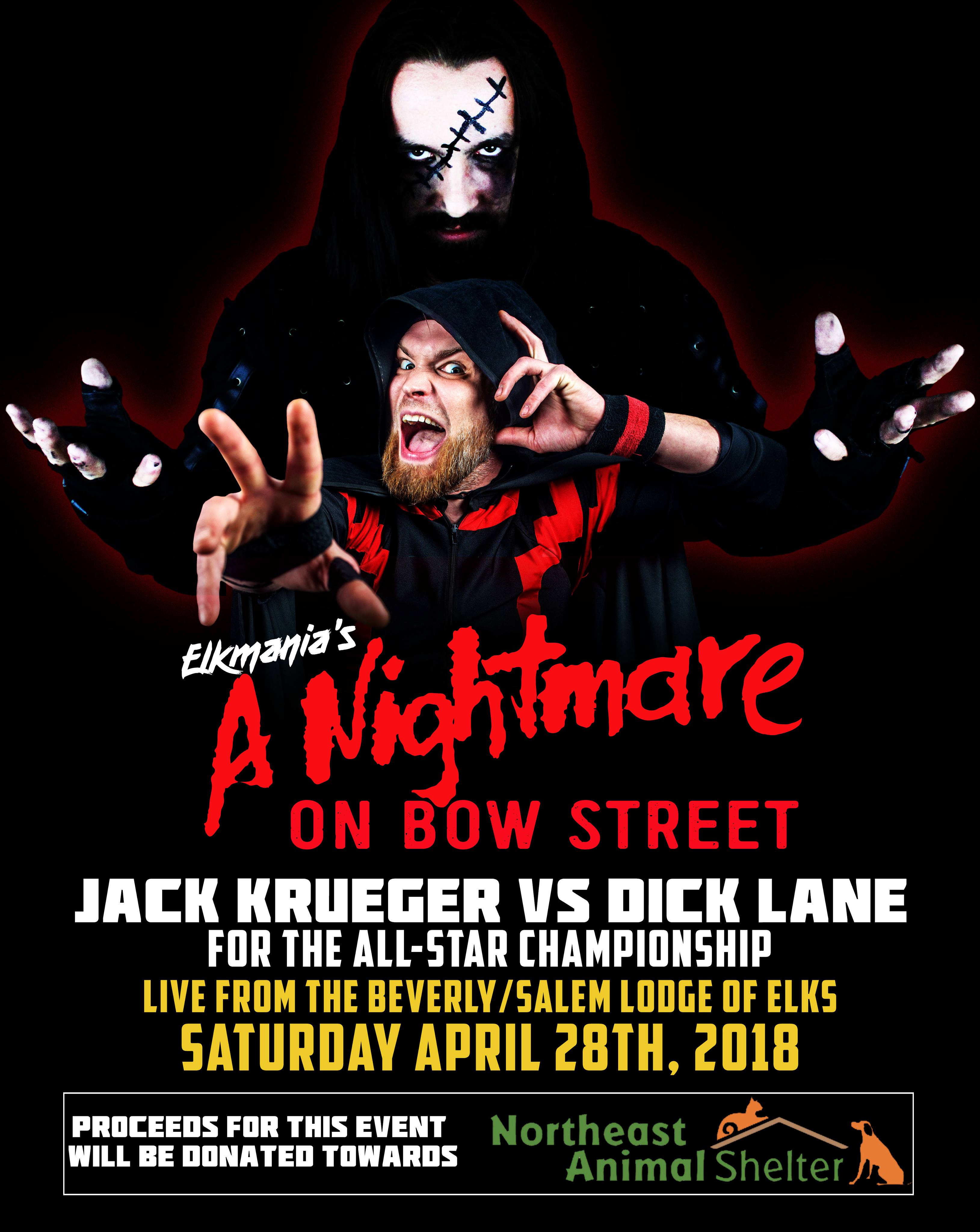 At ElkMania 5, Krueger came within an eyelash of losing the All-Star Championship. Just as victory was in Lane’s grasp, a terrifying horror was unleashed leaving Lane beaten unmercifully. At A Nightmare on Bow Street, Dick Lane will get his rematch for Jack Krueger’s All-Star Title, as Lane believes he has the “anti-life equation” to thwart Krueger’s reign of terror.