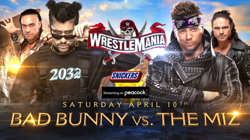 Bad Bunny vs. The Miz: It wouldn’t be WrestleMania without some celebrity involvement. That role this year is filled by Grammy Award-winning recording artist Bad Bunny. The rap superstar got WWE’s attention after releasing his hit single, “Booker T,” inspired by the wrestler of the same name. Bad Bunny and The Miz have had run-ins with each other for weeks. On Raw, Miz challenged Bad Bunny to a match at WrestleMania, and Bad Bunny accepted by smashing a guitar across his back.