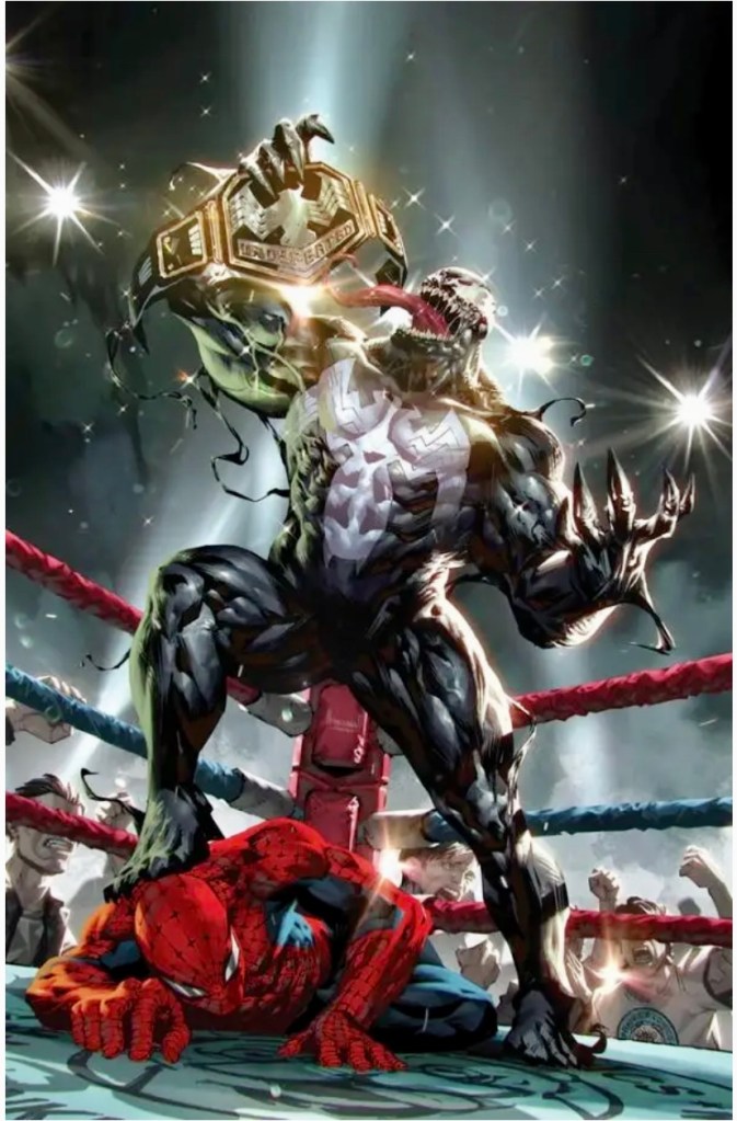 For better or for worse, variant covers are all the rage in comic books right now. Here, Kael Ngu illustrated one of several covers by different artists for this particular issue of Venom. The imagery has nothing to do with the story of the book but a gorgeous shot of the “Lethal Protector” standing over his webbed rival while holding his championship up high. Ngu made excellent use of the wrestling genre with a striking depiction of a victorious Venom.