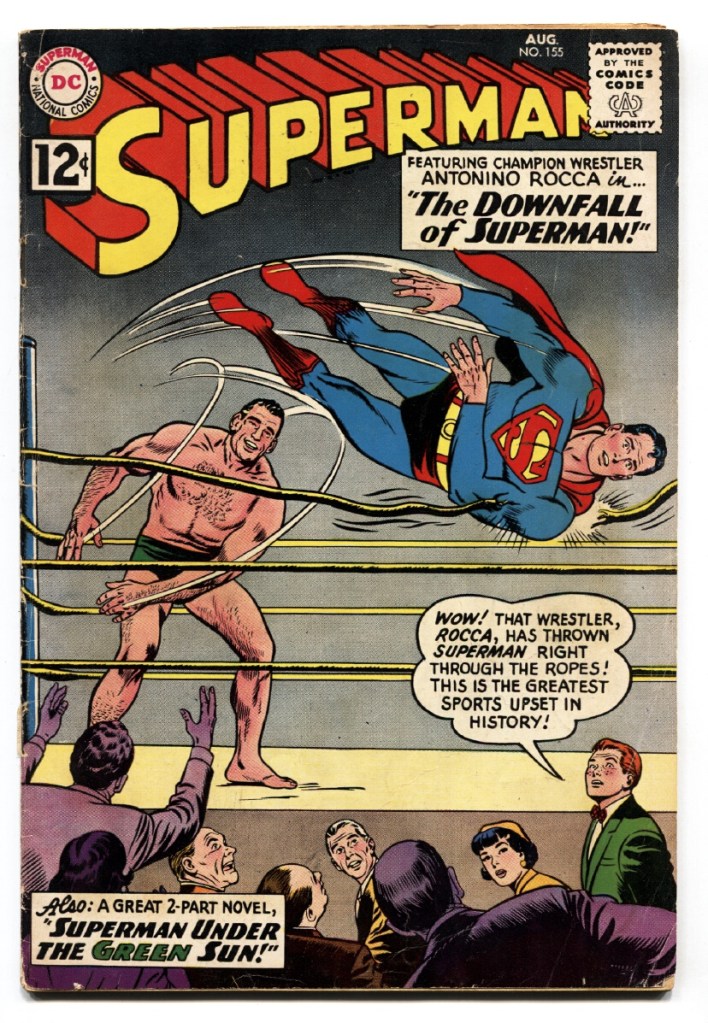 Antonino Rocca is shown throwing Superman out of the ring, under the billing “Antonino Rocca in the DOWNFALL OF SUPERMAN,” with Jimmy Olsen calling it the greatest upset in sports history. Rocaca’s popularity in the 1950s and early 60s can’t be overstated. He was Bruno (Samartino) before Bruno was Bruno. Superman’s battle with Rocca predates his legendary showdown with Muhammad Ali by 16 years. The fact that a comic book was created where Rocca was stronger than the Man of Steel speaks to his imprint on the era. Of course, not everything is as it seems, which comes into play as the how and why of it all is too fun to spoil here.