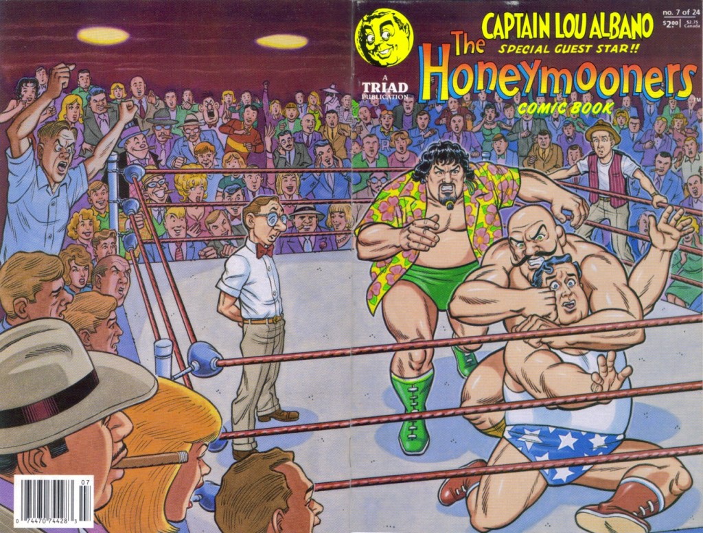Those familiar with the classic 50s sitcom The Honeymooners know of the comedic dilemmas Ralph Kramden and Ed Norton regularly found themselves in. Hall of Fame cartoonist, Jack Davis of MAD Magazine fame, illustrated the cover of this adaptation titled On the Ropes, depicting Ralph’s unenviable position. The Turk, inspired by the late Iron Shiek, looks to put the squeeze on Ralph, but not if guest star Captain Lou Albano has anything to say about it. The referee stands idly by while Norton is beside himself on the ring apron. Davis took inspiration from the famous Superman vs. Muhammad Ali cover with audience cameos Archie, Frankenstein, White Spy (Spy vs. Spy), W.C. Fields, and more. Overall, a gorgeous wrap around cover exhibiting the in-ring zaniness of this Albano/Kramden team-up.
